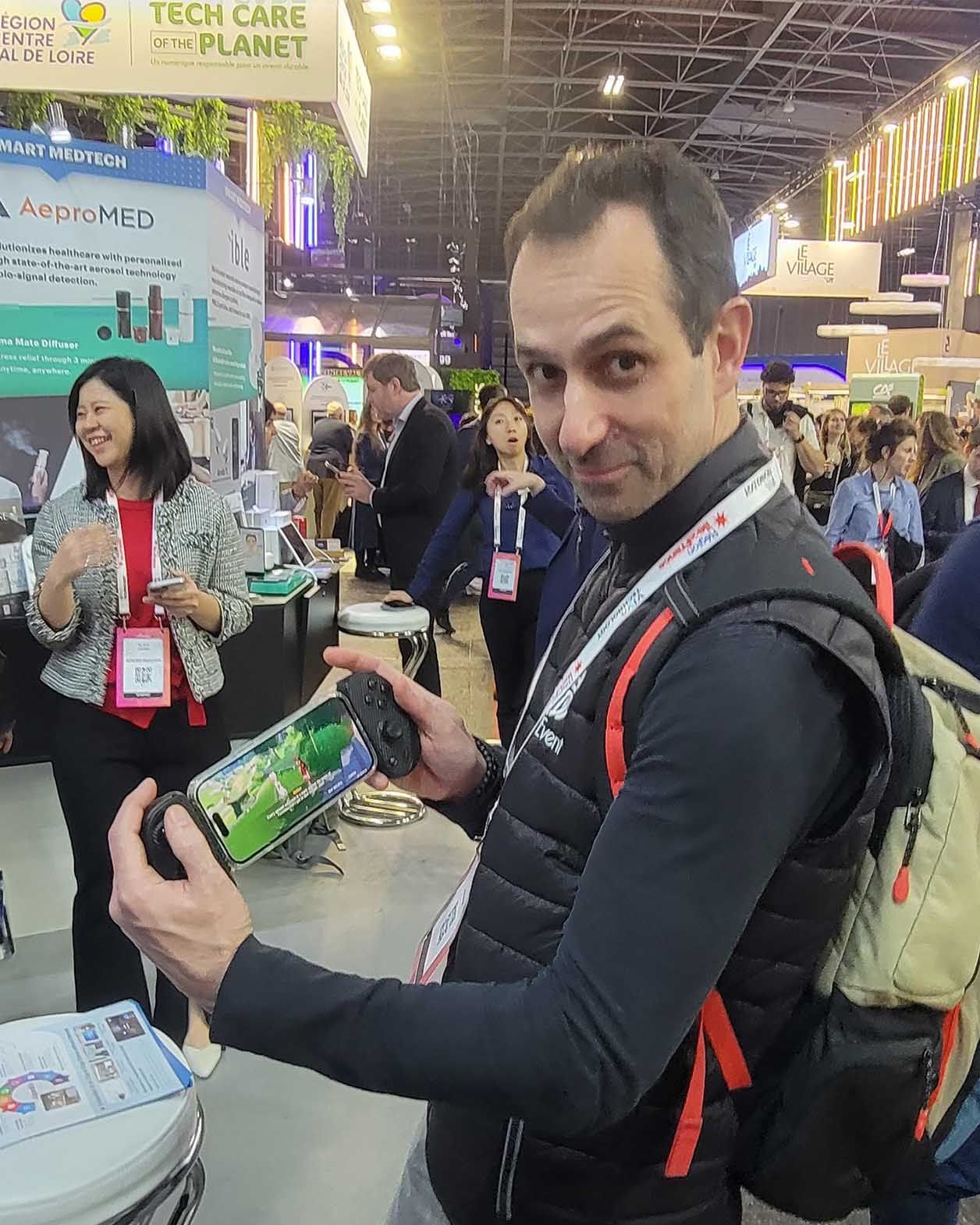 A female booth visitor says the Serafim S3 mobile gaming controller feels like it was made for my hands—so comfortable at Viva Tech 2024