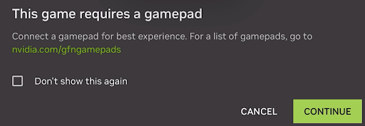 After selecting a game, log into your NVIDIA GeForce NOW account. If you see the warning message below, don’t worry—Serafim S3 is a compatible gamepad. To prevent this prompt from reappearing, check the box and click continue.