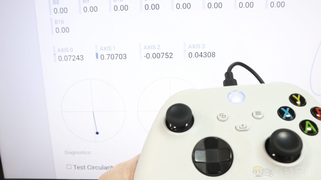 至於 Serafim S3 的類比搖桿表現如何呢?從「Gamepad tester」測試結果來看,類比搖桿推移的過程中,並未受到其不可控的力道拉扯,放開後可以正常回中,各軸殘留數值約為 ±0.0039,偏差值相當小,無飄移問題。
