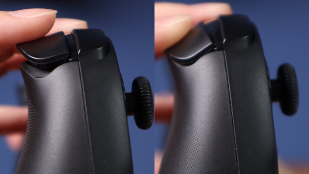 扳機部分,前方的 LB、RB 鍵,個人體驗上覺得沒什麼問題,但後方的 LT 與 RT 感覺可以再加強一下會更好,Serafim S3 後方扳機設計上按到底會直接與下方握柄碰觸,再加上鍵程又短,對於習慣長鍵程的玩家來說,按下去很快就會到底,較難以感到扳機的漸進感。