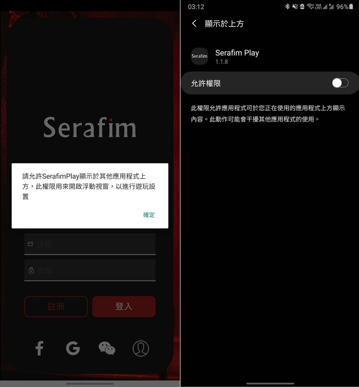 圖:初次使用 Serafim Play 需要同意包括「顯示於上方」的多個權限。