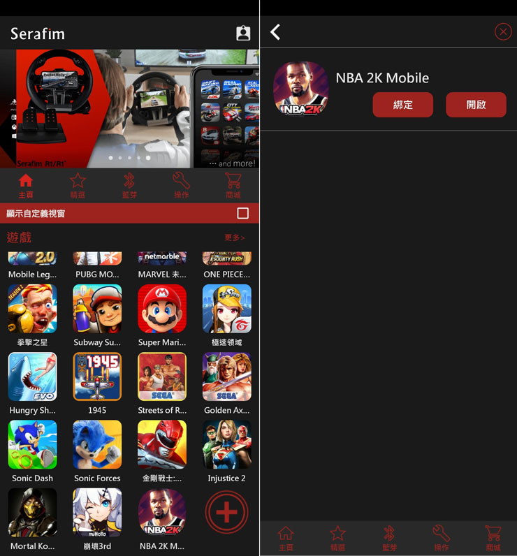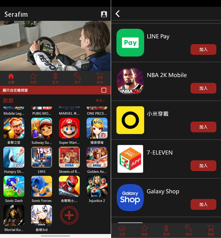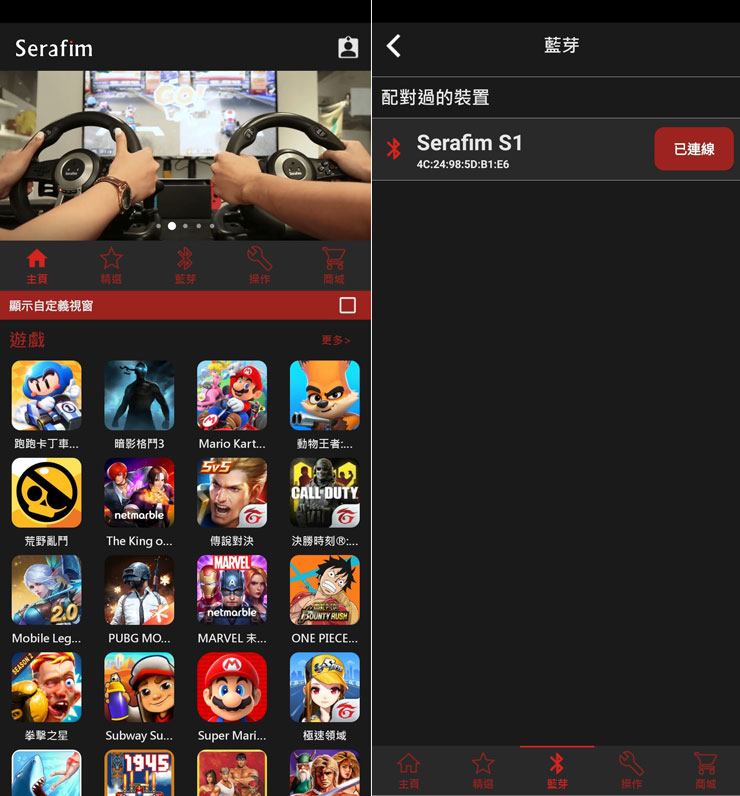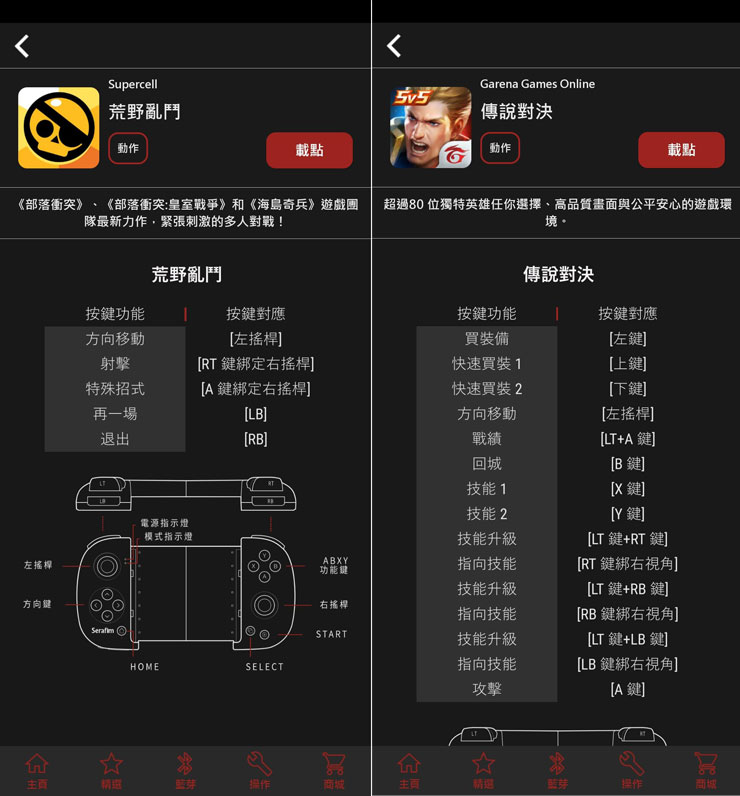 目前市面上常見的手機遊戲手把,多半只能透過遊戲本身自帶手把操控支援來使用,其他標榜支援可對應手遊虛擬按鍵的款式,也多半需要進行手機 ROOT 或是透過特定的軟體下載平台安裝特定的遊戲 APK 來實現按鍵映射,對玩家來說使用相當不便,而 Serafim S1 則是設計有專屬的「Serafim Play」應用程式,可以輕鬆地透過這套工具來完成不同遊戲內的虛擬按鈕對應,讓原本只能「搓螢幕」操控的手機遊戲也能透過手把來輕鬆操控!