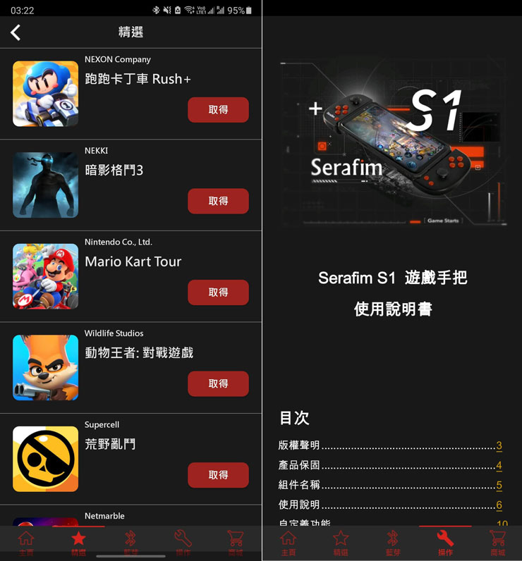 圖:Serafim Play 也有「精選」分頁讓大家快速選擇適合的遊戲,另外「操作」分頁則是很貼心地附上了數位版的使用說明書。