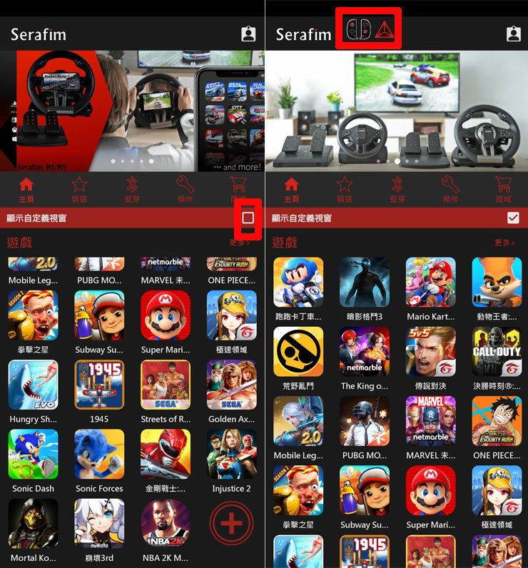 圖:在 Serafim Play 的主頁遊戲列表上方,可看到「顯示自定義視窗」的勾選,啟動後上方會多出一組浮動按鍵。