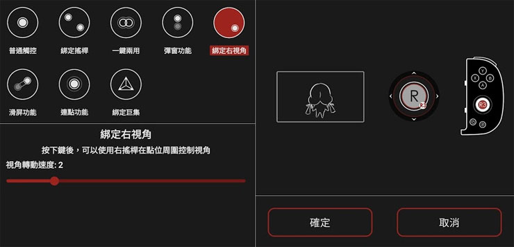 圖:另外其他的按鈕也有相當豐富的設定方式,也全面考量到遊戲操控的需求,像是這個「綁定搖桿」的選項,就可以將特定的按鈕綁定在搖桿上,在遊玩一些需要類比搖桿操控的遊戲時,就可以用這個功能簡化操作哦!