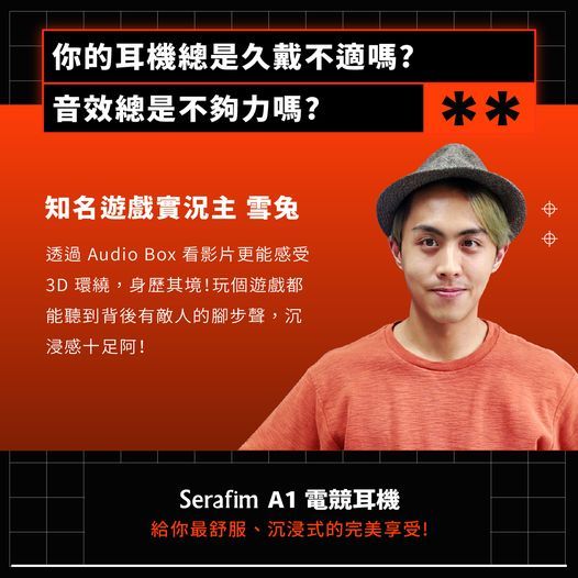 「當我帶上 Serafim A1 電競耳機時,能感受到耳罩的舒適度不同以往所帶的有線耳機,透過 Audio Box 看影片更能感受 3D 環繞,身歷其境!玩個遊戲都能聽到背後有敵人的腳步聲,沉浸感十足阿!」