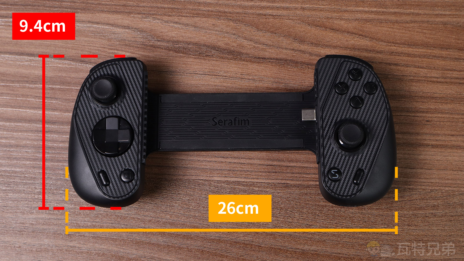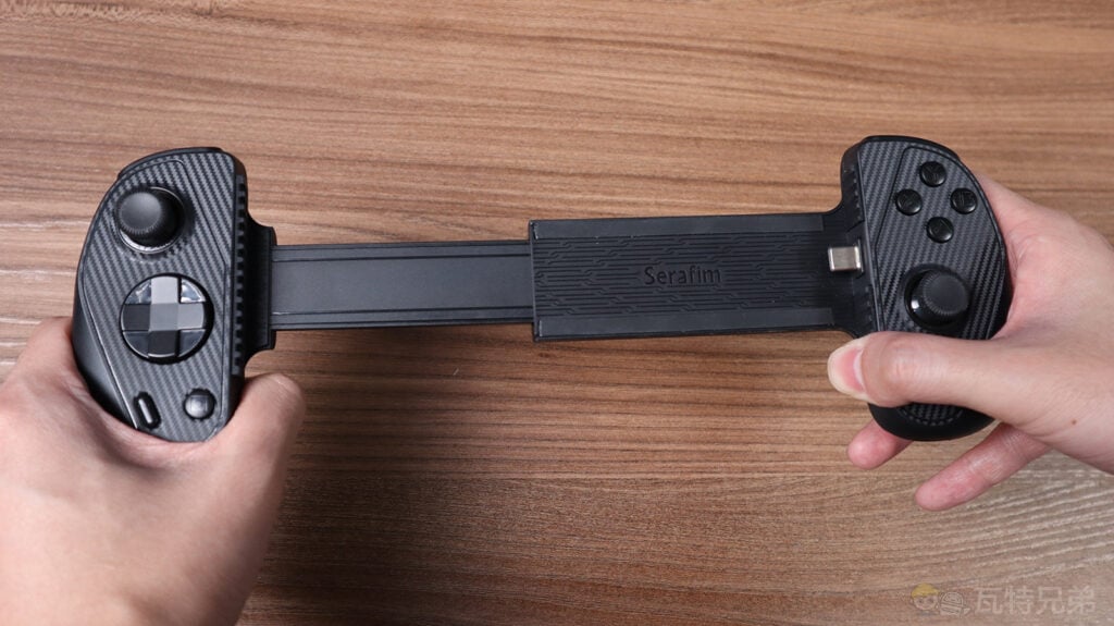 The Serafim S3 is designed specifically for mobile use. It is similar in appearance to handheld consoles like the Switch or Steam Deck. However, it features a phone stand instead of a built-in screen. The Serafim S3 measures about 26 x 9.4 x 3.4 cm when not connected to a phone. The adjustable phone stand can hold up to 17.9 cm long, fitting models like the iPhone 15 Pro Max and Galaxy S24 Ultra.